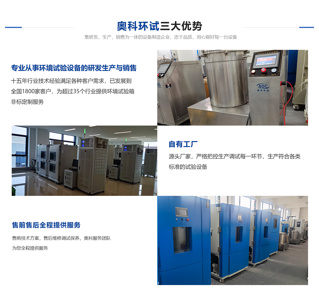 安徽奧科試驗設備有限公司隸屬于杭州奧科環境試驗設備有限公司直屬分公司,是一家從事各種試驗設備研發、生產與銷售一體的技術單位??偣緭碛袕姶蟮募夹g團隊及科學嚴謹的生產流程,鑄就了產品質量。公司本著“以質量求生存,以信譽求發展”的原則,為科研、軍事、航空、電子、汽車、石油、化工、醫療、通訊等各大院校和企事業單位提供符合GB、GJB、IEO、ISO、ASTM、MIL、DIN等標準的各類環境試驗設備,并可根據用戶的需求設計制造各類非標性設備。奧科奉行“進取求實嚴謹團結”的方針,不斷開拓創新,以技術為核心、視質量為生命、奉用戶為上帝,竭誠為您提供高性價比的自控產品及無微不至的售后服務。